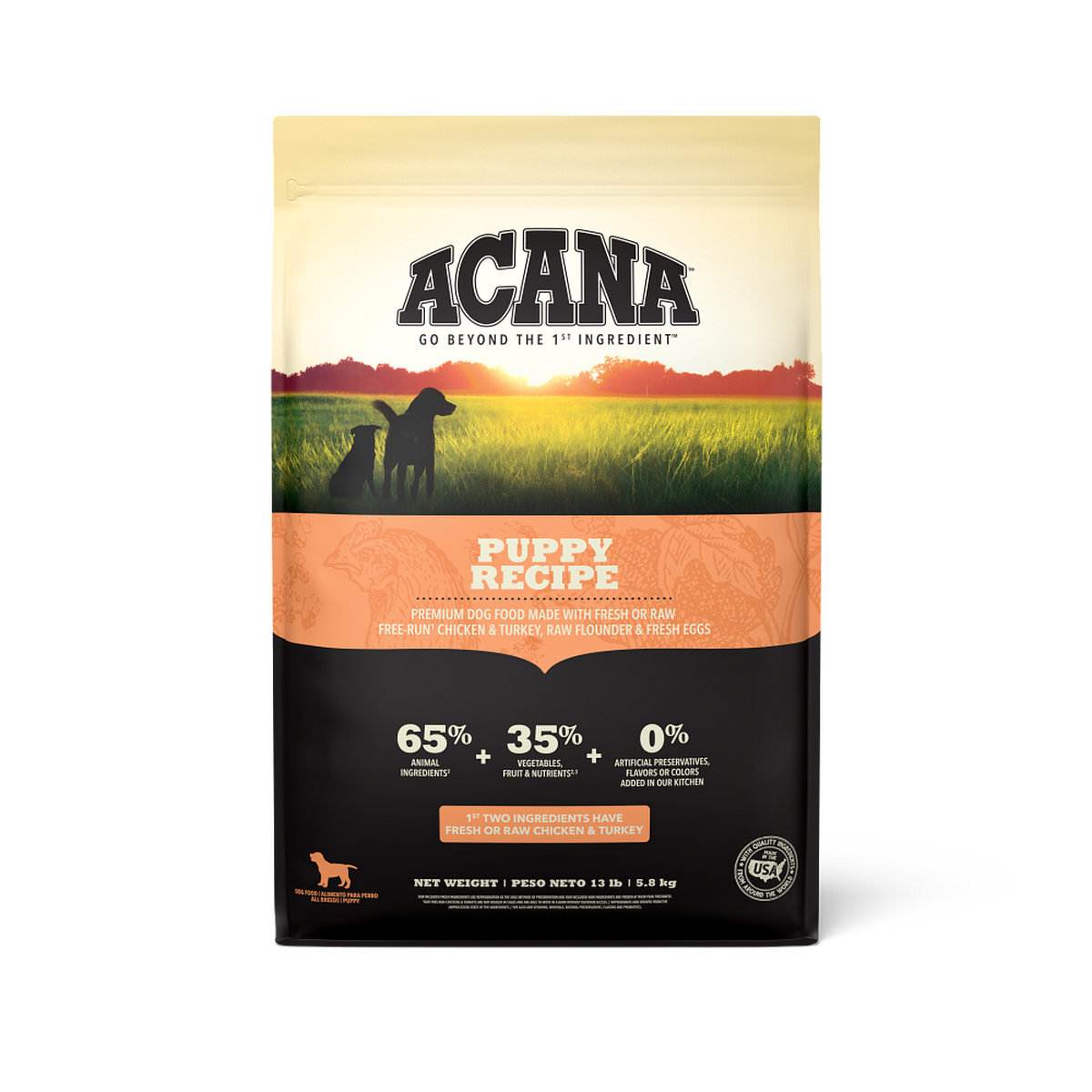 Nos obsesionamos con cada ingrediente de nuestras recetas de alimento para perros ACANA™, asegurándonos de que cada una deleite a tu perro con sabor y nutrición. Por eso, nuestra receta de alimento seco para cachorros ACANA está cuidadosamente elaborada para ayudar a nutrir las necesidades de tu cachorro en crecimiento, incluyendo el desarrollo cerebral, muscular y óseo, y un tamaño de croqueta más pequeño, perfecto para bocas en crecimiento. Este alimento para cachorros está equilibrado con un 65 % de ingredientes animales ricos en proteínas, como pollo y pavo de corral, lenguado crudo y huevos frescos, y un 35 % de verduras, frutas y nutrientes saludables. ¡Nuestra receta de alimento para cachorros ACANA los hará sentir tan bien por dentro que lo notarás por fuera!