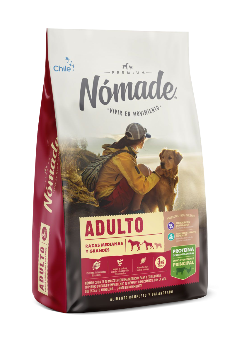 Nómade es un alimento para perros adultos de razas grandes y medianas desarrollado por expertos en nutrición animal.
