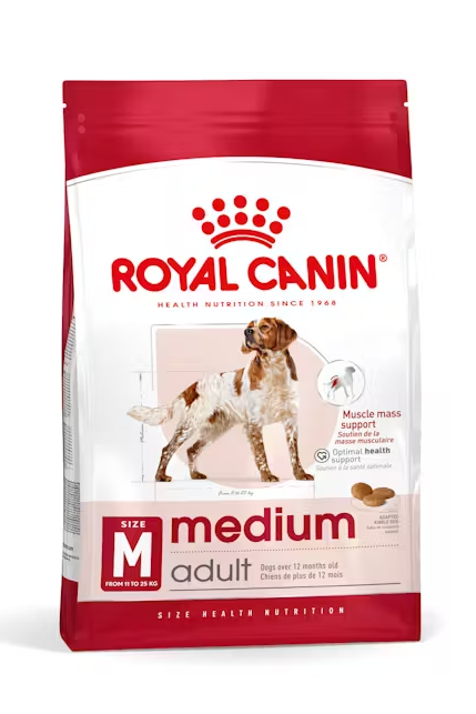 Perro Mediano Adulto de ROYAL CANIN® es una fórmula nutricionalmente completa y equilibrada especialmente diseñada para satisfacer las necesidades particulares de su perro mediano y apoyarlo durante su edad adulta. Esta dieta es para perros medianos que pesen entre 11 y 25 kg y tengan más de 12 meses. Los perros de tamaño mediano dependen del ejercicio constante para un desarrollo muscular adecuado. Esta fórmula está diseñada para ayudar a mantener la masa muscular con su contenido de proteÃna especializado de alta calidad. Sus estilos de vida enérgicos exponen a los perros de tamaño mediano a elementos ambientales que pueden debilitar su sistema inmunológico. Esta croqueta contiene prebióticos y una mezcla de vitaminas, incluidas las vitaminas C y E, para ayudar a reforzar sus defensas naturales. Los perros adultos de tamaño mediano necesitan nutrientes especÃficos para ayudar a mantener su salud general. Esta croqueta, que incluye una mezcla equilibrada de nutrientes altamente digeribles, ayuda a favorecer la máxima absorción, ayudando a su perro a mantenerse sano y lleno de vida.